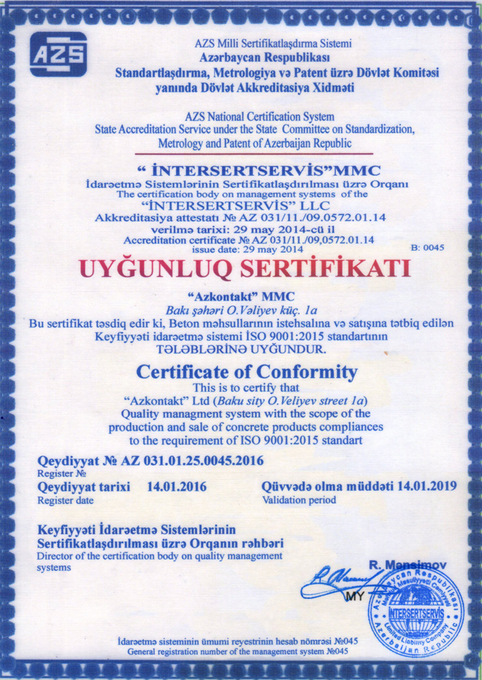 "AZKONTAKT" MMC - UYĞUNLUQ SERTİFİKATI
