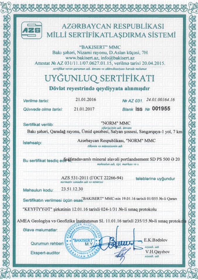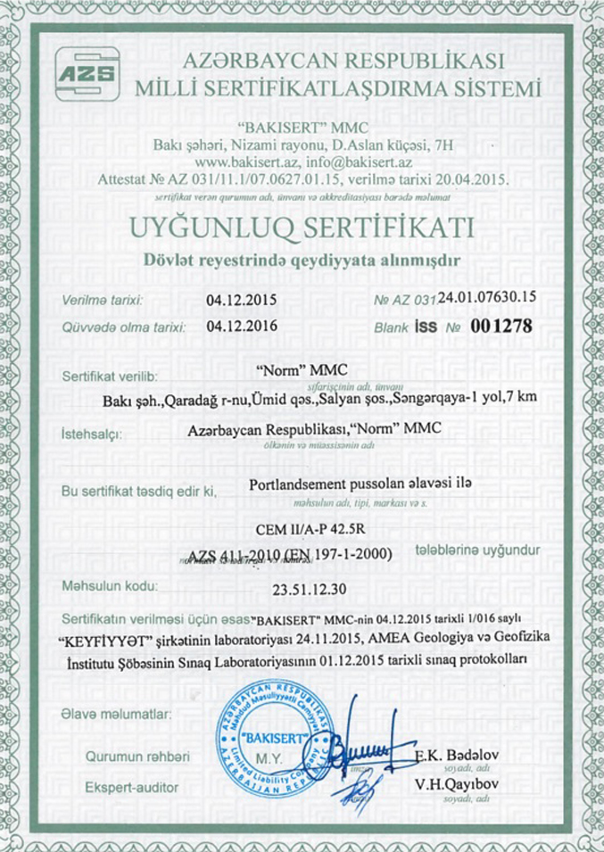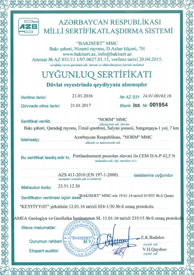 "NORM" MMC - UYĞUNLUQ SERTİFİKATI